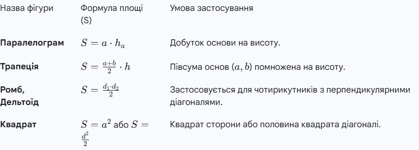 Обчислення площі чотирикутника (S) є ключовою прикладною навичкою. Для різних типів фігур застосовуються спеціальні або універсальні формули. Для будь-якого опуклого чотирикутника (навіть нерегулярного) площа може бути знайдена, якщо відомі довжини діагоналей та синус кута між ними:
