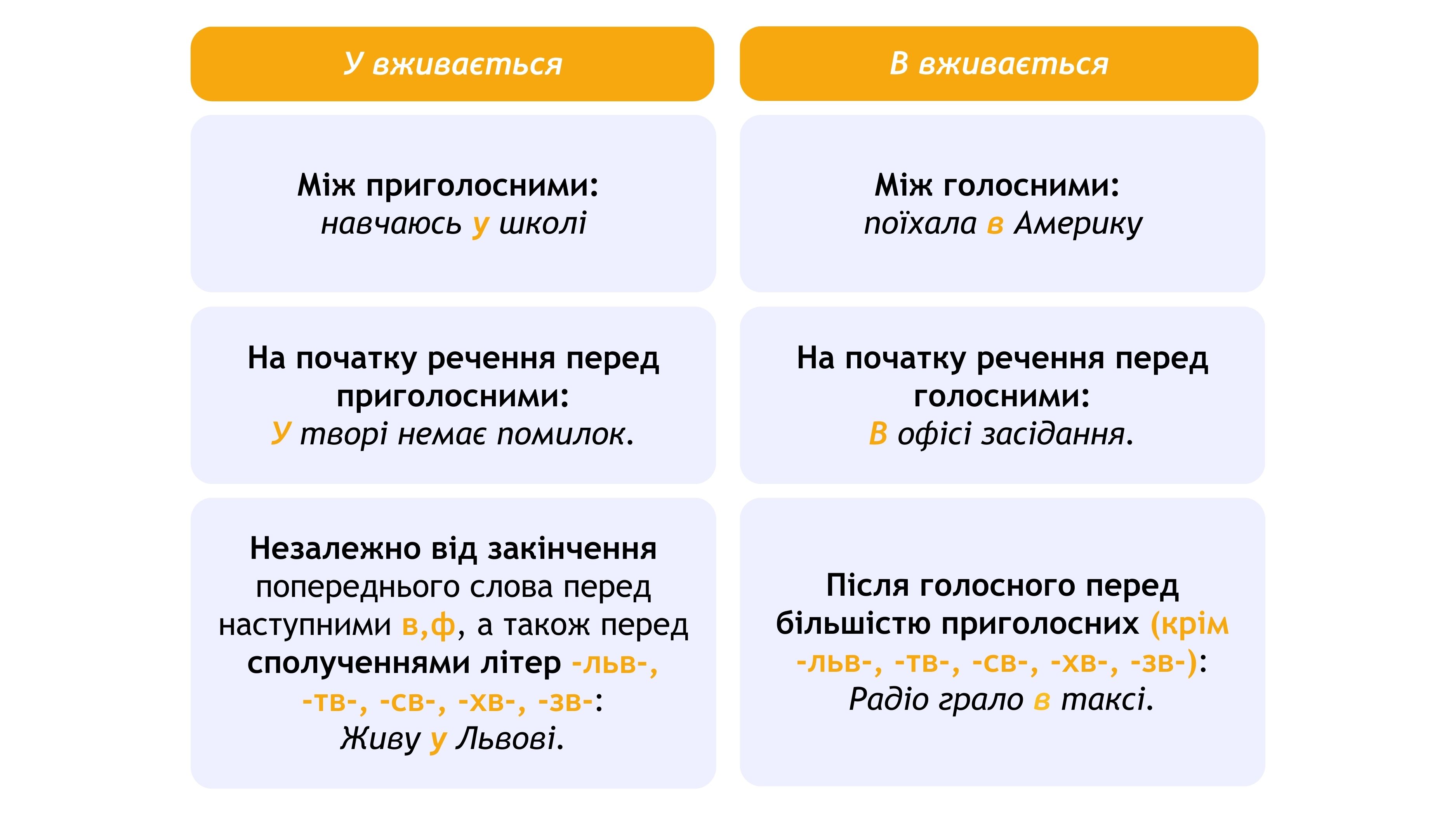 Розгляньмо таблицю з правилами чергування звуків “у” та “в” в українській мові, що допоможуть забезпечити милозвучність мовлення.