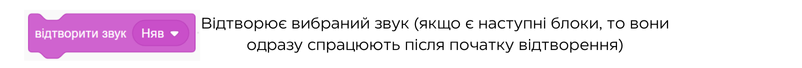 З допомогою блоків звуку діти можуть додавати звукові ефекти та музику до своїх проєктів. Наприклад, спрайт може “відтворити звук “няв” або “зупинити всі звуки”.
