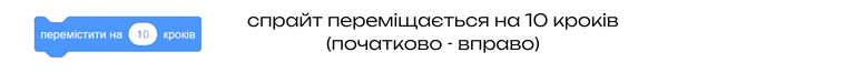 Ці блоки відповідають за переміщення спрайтів (персонажів або об’єктів) на екрані. Діти можуть використовувати блоки руху, щоб сказати спрайту, наприклад, “переміститися на 10 кроків вперед” або “повернутися на 15 градусів вправо”.