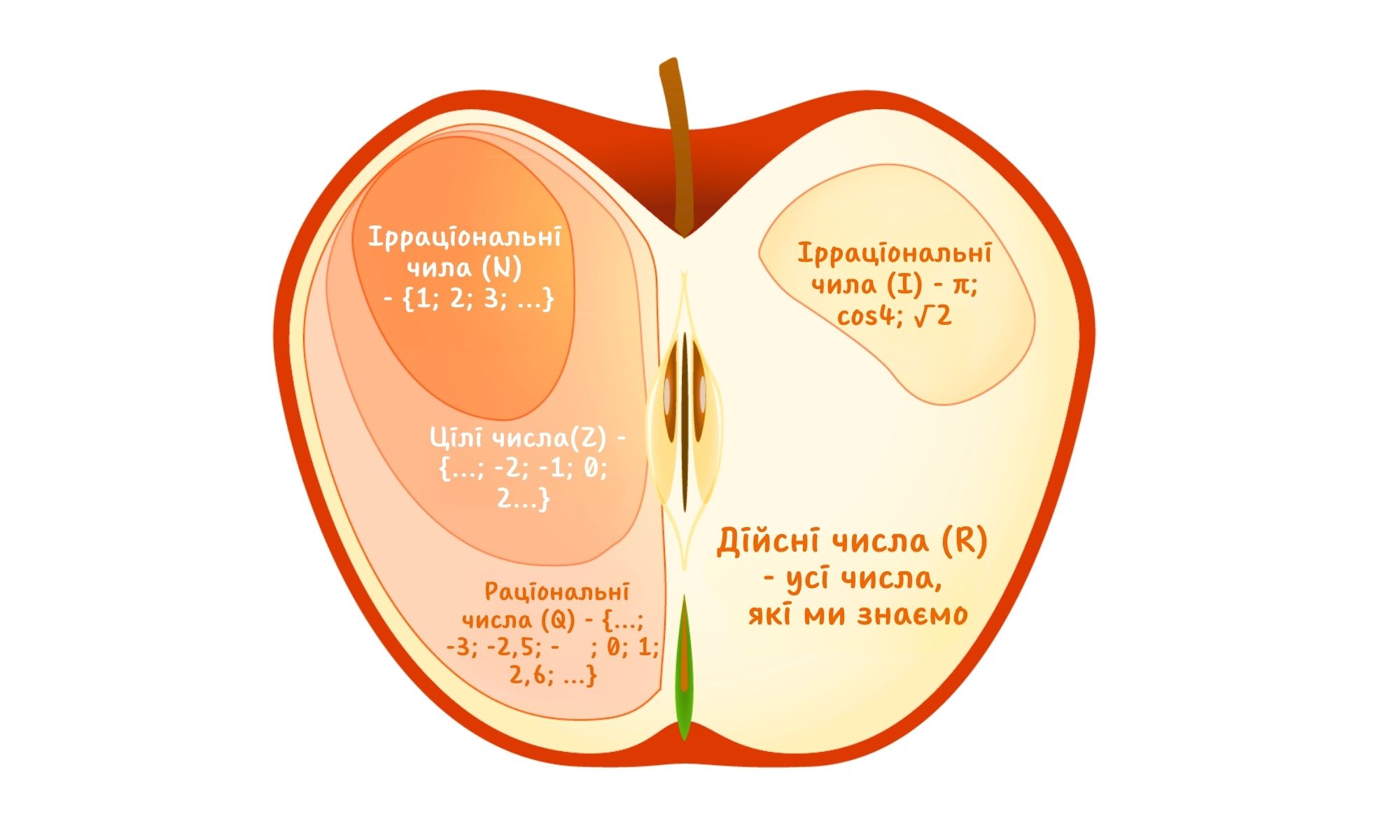 | R | Дійсні | усі додатні, від’ємні числа, нуль, дроби, раціональні та ірраціональні числа | 3; 0; -2; ½; 3,14; √2; π |