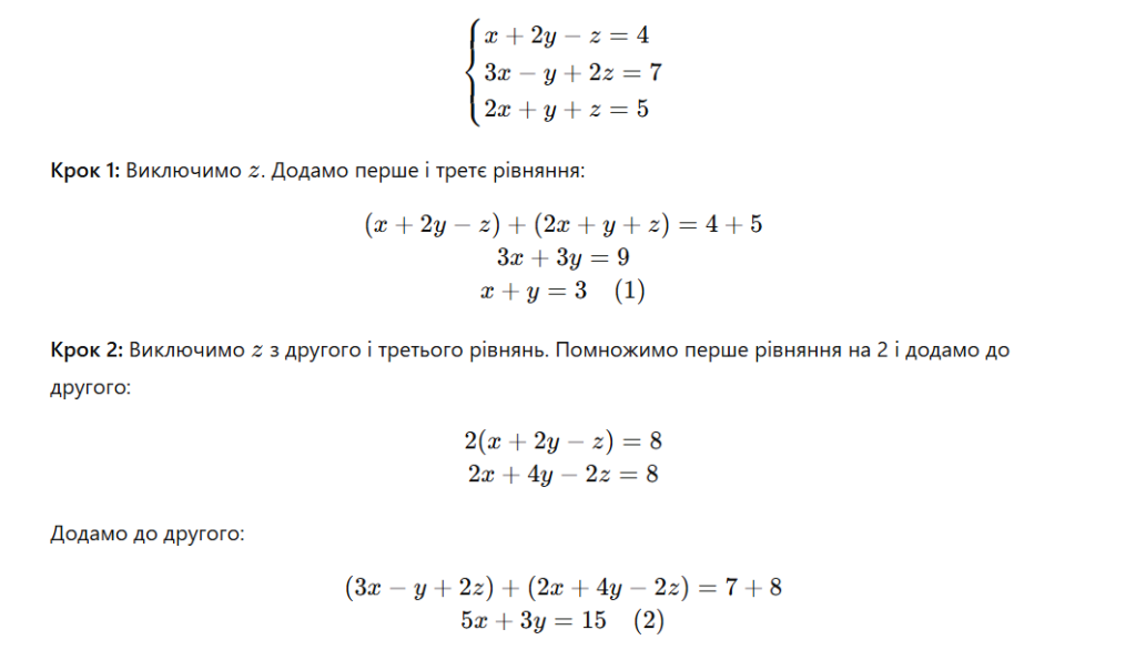 Приклад 2. Розв’язання методом додавання для системи з трьома невідомими